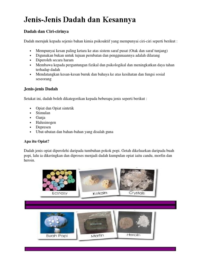 Info untuk anda dalam mengenal jenis dadah dan kesannya terhadap diri dan persekitaran. Sebarang pertanyaan/komen/cadangan boleh berhubung di. Candu,morfin,heroin dan kodein ~sejenis bahan perubatan untuk tidur atau melegakan kesakitan. Masalah dadah di malaysia menjadi semakin bertambah serius terutamanya dalam era pasca perang dingin dan era globalisasi. Jenis, kesan dan bahaya dadah.