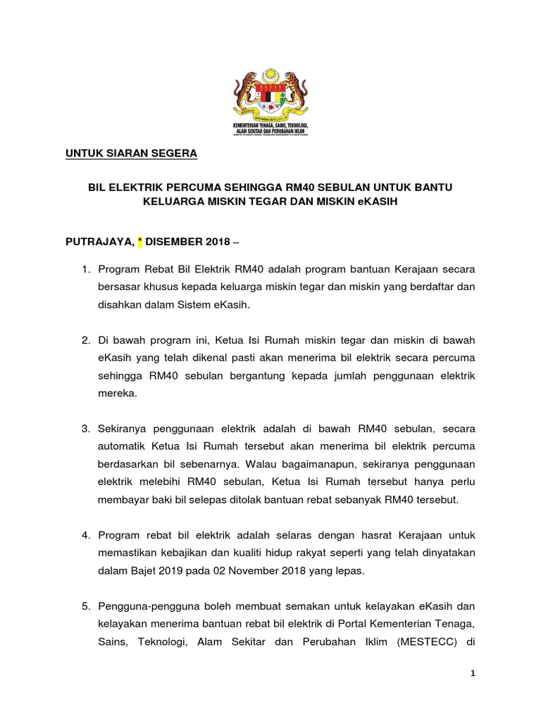 Rebat bil elektrik rm40 akan menggantikannya dan diberikan kepada sejumlah 185,000 miskin tegar dan miskin yang berdaftar dan disahkan dalam berikut adalah cara untuk membuat semakan sama ada layak atau tidak untuk menerima bantuan rebat bil elektrik rm40 melalui semakan secara atas. Cara untuk membuat semakan adalah seperti berikut bukan setakat semak bil elektrik sahaja, tapi dalam mytnb ni ada beberapa servis yang boleh dibuat secara online seperti open dan close account. Bermula 1 januari 2019 depan kerajaan akan mula melaksanakan program rebat bil elektrik rm40.00 untuk membantu keluarga miskin tegar dan miskin yang berdaftar dan disahkan dalam sistem ekasih. Semakan kelayakan rebat bil elektrik rm40 percuma 2020 semakan my. Program rebat bil elektrik adalah selaras.